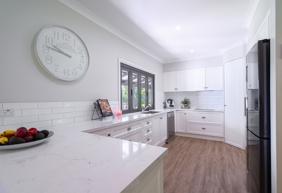 - Stylish Hamptons-inspired kitchen featuring breakfast bar and servery window to the rear patio